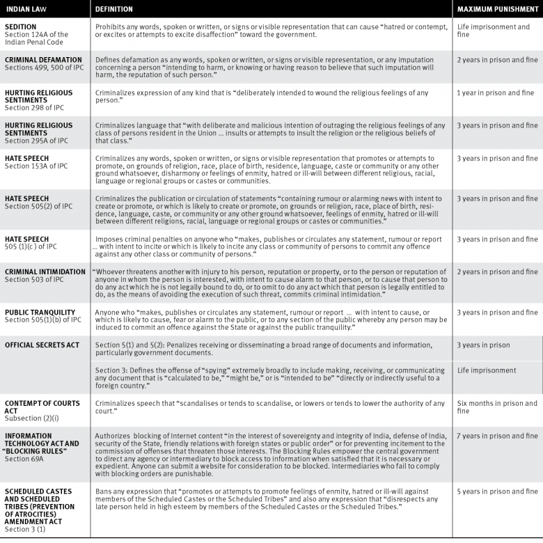 The report is based on an in-depth analysis of various provisions of the Indian Penal Code, including laws on sedition, criminal defamation, hate speech, and hurting religious sentiment, as well as the Official Secrets Act, Information Technology Act, and Contempt of Courts Act. It is based on interviews with defendants and targets, civil society activists, journalists, and lawyers. It includes public statements by the government, court documents, and media accounts of criminal proceedings against those involved in peaceful speech activities or peaceful assembly.